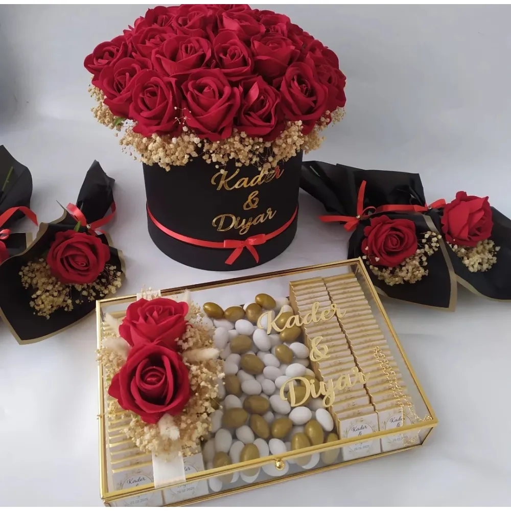 100 Adet Baskılı Madlen Çikolata 500 Gr. Dolgulu Badem Draje 3 Adet Hediyelik Çicek ve Kutu Çiçek